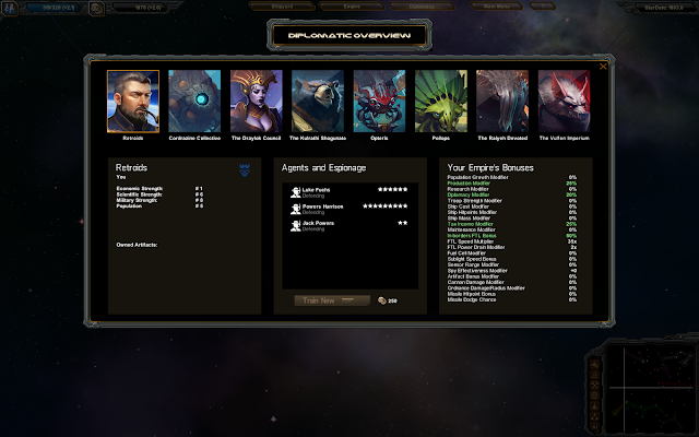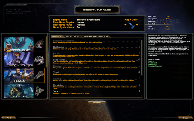 Beginning a game of Stardrive has more customisation options than a luxury car salesroom, and is only the start of levels of detail perhaps unseen since Galactic Civilizations 2. The game options are self explanatory, changing the size, abundance and difficulty of the universe as well as the relative speed, I kept the default, normal difficulty, medium size with a normal amount of solar systems along with having the full seven opponents. Picking race is between human and the seven alien races, all have their own basic traits but your chosen race is fully customisable. Selecting traits uses a skill point system which allows you to choose negative buffs in order to obtain more points for specific positive racial traits. It took me a long time to decide what way to inconvenience my human population in order to conquer the galaxy. I just went with all minor positive traits so that I was able to have a foot-up near the start! So the Retroid race was born and their quest for control of a turbulent galaxy commenced...