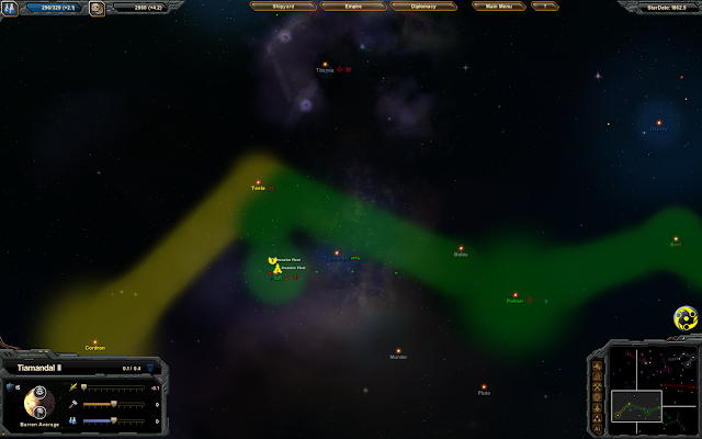 Talking of enemies, it's been a fairly peaceful overview of the game so far! But Stardrive has that deceptive effect. Alien species communicate with you periodically, and the introductions allow you to question them (as far as they are happy to answer) and negotiate trading and peace terms. Although none agreed to join a federation with the Retroids in control they all agreed to non-aggression pacts and all but one to trading agreements. I acquired much technology over time by trading and this supplement to the research was invaluable. All alien races are well illustrated, have their own personalities and communicating with them actually felt like it meant something - a feature that is missing in a lot of strategy games. Whilst the initial peace lasted all of about 15 minutes until they told me that my pitiful fleets meant that I was next on the list of races to be exterminated it wasn't until about an hour or so into the game before the Cordrazine collective finally declared war on me. A war that I felt was going well until their invasion fleets arrived. At this stage I hadn't researched enough big ships but held them off with plenty of small fighters before they overwhelmed my farthest systems. They then decided to steal my colonies! Stardrive's colony invasions meant that several of my colonies were lost to troops from the Cordrazines. If I had had finished researching terraforming I would have been able to put ground troops and defences on my planets to withstand these bombardments, but I hadn't so I couldn't and thus lost two solar systems in what equated to around 100 turns. I retreated to the rest of my empire.