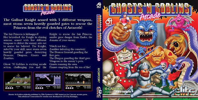 In March of 2015 Nostalgia blew us all away with their C64 release of 'Commando Arcade SE'; a brilliant Arcade revamp of the 1980's C64 hit classic Commando. It was a faithful version to the Arcade and featured more levels, new level features, new graphics, a new scroller and much much more. Yet they weren't content with doing just Commando, as Nostalgia are hopefully going to release Ghosts'n'Goblins Arcade this weekend, perhaps even today Saturday! (See Update). True to form, this version will once again be a faithful version to the original arcade, whereas the original Commodore 64 version is somewhat different from the arcade version as it only features the Graveyard and Forest, The Ice Palace, The Floating Platforms and Firebridge and The Caves in that order. So if you thought Commando Arcade SE was brilliant, wait till you play this latest overhaul!
